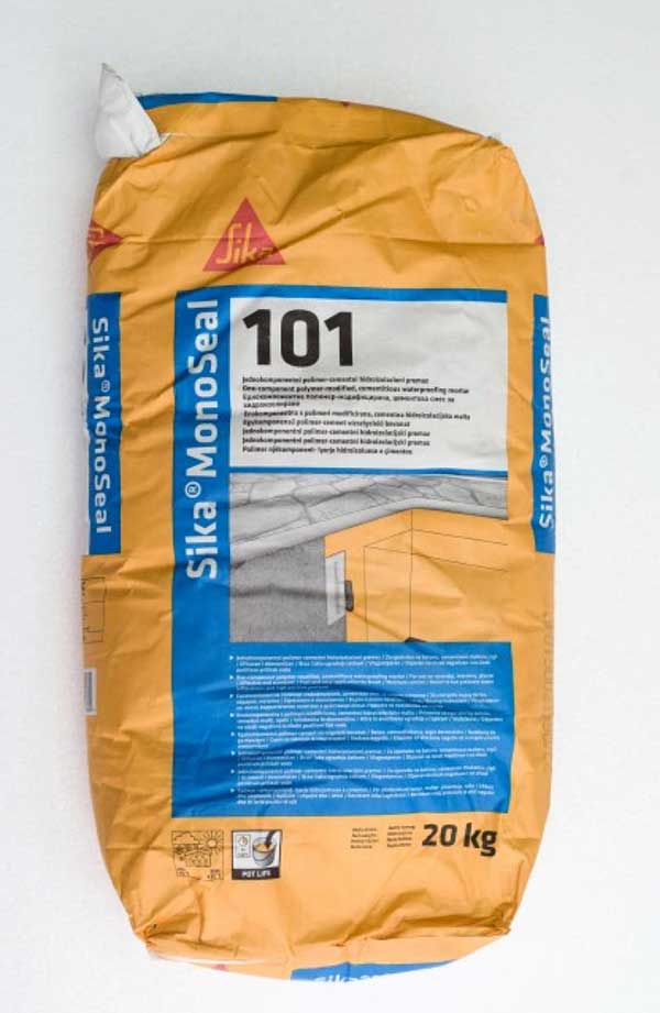 Sika Monoseal 101 je jednokomponentna smesa specijalnog cementa i agregata, obogaćena vodoodbojnim i vodonepropusnim sintetičkim proizvodima, koja se meša sa vodom, formirajući pastu, konzistencije koja omogućava nanošenje četkom, a ujedno poseduje dobre osmotske karakteristike. Upotreba Podrumske, suterenske prostorije i temeljne ploče. Liftovska okna Ukopani i zaštitni zidovi Jame i šančevi Rezervoari i bazeni.
